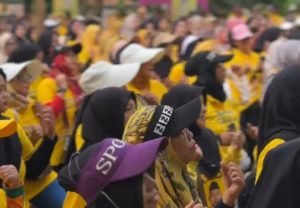 Dengan mengenakan kaos kuning khas Golkar, mereka mengikuti senam sehat yang digelar dalam rangka memperingati Hari Ulang Tahun (HUT) ke-60 Partai Golkar.
