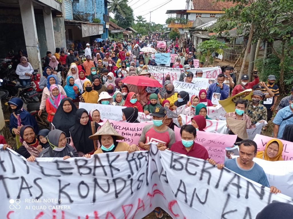 METROPOSTNews.com | Lebak — Aksi Demonstrasi Massa yang berlangsung di Kampung Cicalung, Desa Mekarjaya, Kecamatan Panggarangan, Kabupaten Lebak_Banten, diwarnai dengan pembentangan puluhan spanduk. Salahsatunya bertuliskan tuntutan bahwa, Bupati Lebak Harus Bertanggungjawab atas kondisi jalan Kabupaten ruas Cikumpay – Ciparay, Kecamatan Panggarangan, Senin (29/11/2021).