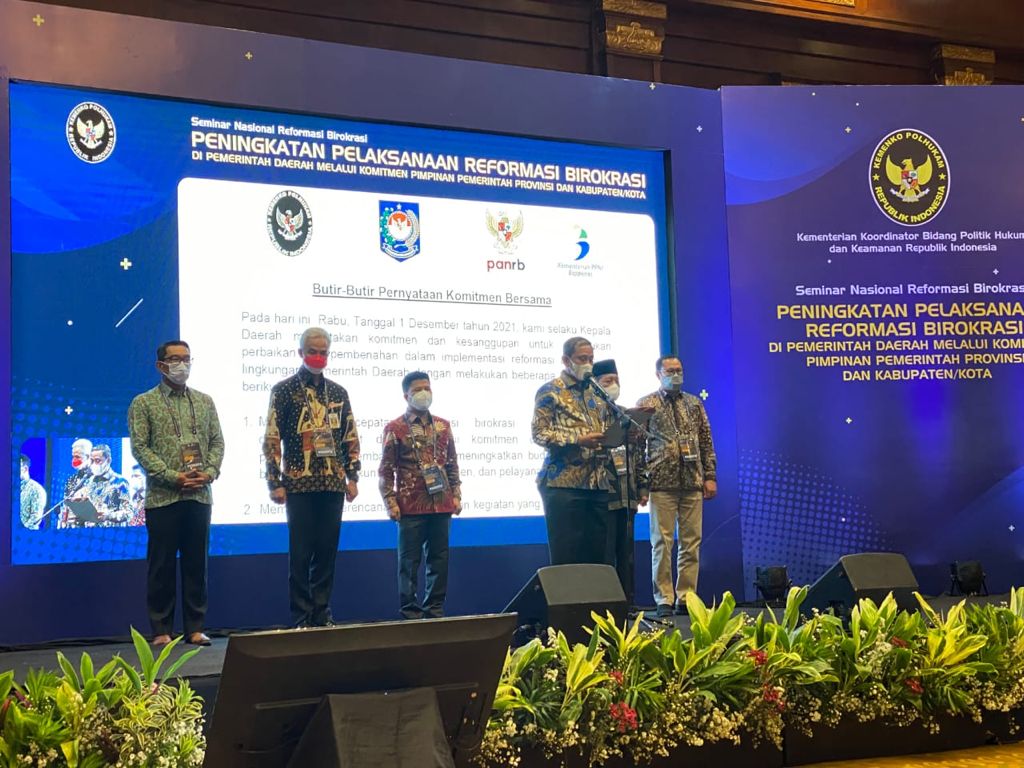 Pembacaan komitmen ini dilakukan di sela-sela seminar nasional reformasi birokrasi yang digelar Kementerian Koordinator Politik, Hukum, dan Keamanan (Kemenkopolhukam) Republik Indonesia di Hotel Bidakara, Jakarta, Rabu (1/12/2021). Deretan kepala daerah se-Indonesia ambil bagian pada kegiatan ini.