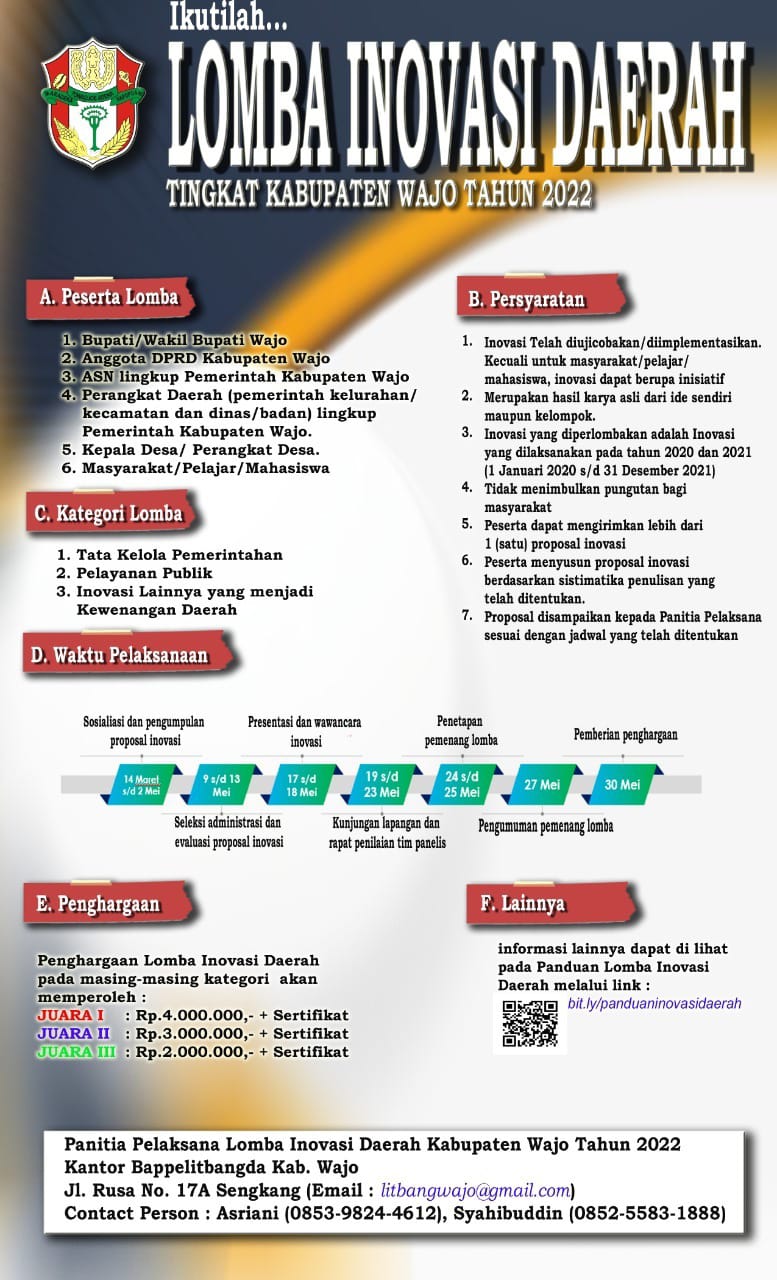 Kepala Bidang Penelitian dan Pembangunan Bappelitbangda Wajo, Andi Arwin, menjelaskan waktu pelaksanaan lomba ini sekitar 2,5 bulan, mulai 14 Maret 2022 hingga 30 Mei 2022.