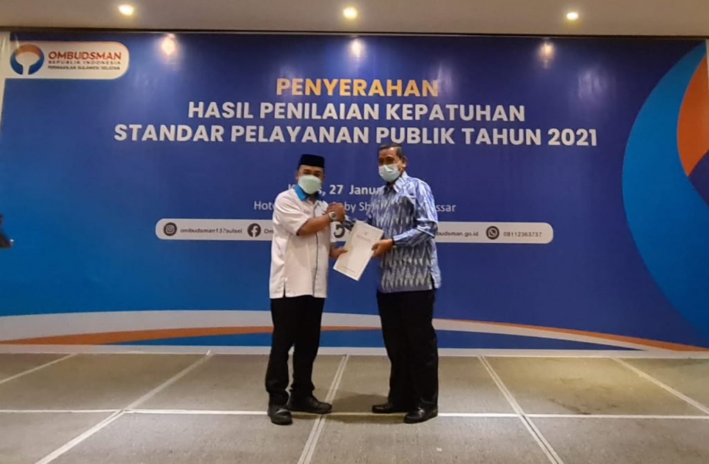 METROPOSTNews.com | Makassar – Bupati Wajo, Amran Mahmud, menghadiri penyerahan penghargaan dan rapor hasil penilaian Kepatuhan Standar Pelayanan Publik 2021 terhadap pemerintah daerah oleh Kantor Perwakilan Ombudsman Sulawesi Selatan (Sulsel) di Four Points Hotel by Sheraton, Kota Makassar, Kamis (27/1/2022).