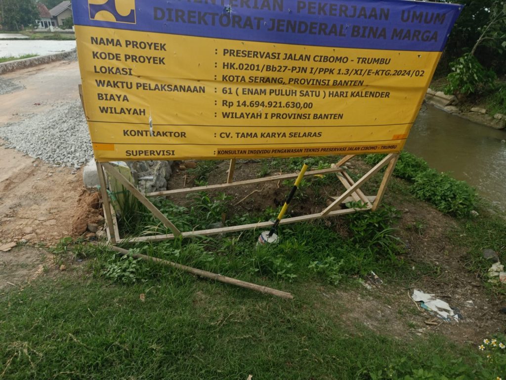 Metropostnews.com-SERANG – Adanya pembangunan Jalan betonisasi dikelurahan Priyai, kelurahan Bendung dan Kelurahan Terumbu kecamatan Kasemen Kota Serang dari Kementrian Pekerjaan Umum Direktorat Jenderal Bima Marga PJN Wilayah 1 Provinsi Banten yang sedang dilaksanakab oleh penyedia jasa CV. TAMA KARYA SELARAS dengan nilai Rp.14.694.921.630,00 dengan waktu kalender enam puluh hari , nama Proyek Preservasi Jalan Cibomo – Terumbu kode proyek : HK.0201/Bb27 – PJN 1/ PPK 1.3/ XI/E-KTD.2024/02.