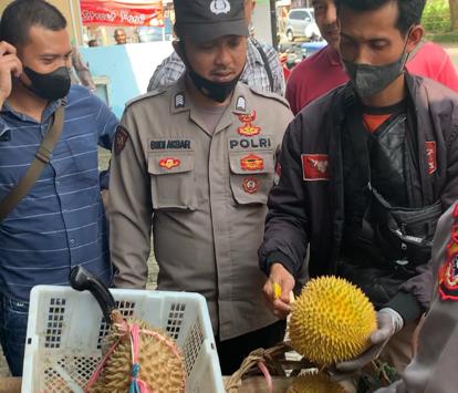 Pedagang durian tersebut sedang menjajakan barang dagangan, bersamaan dengan kedatangan Kapolres Banjar di PKM tersebut untuk meninjau pelaksanaan vaksinasi.