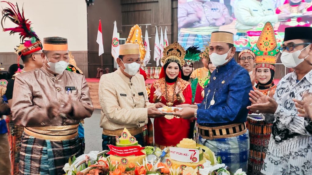 Dalam Peringatan HUT Ke-76 PGRI dan Hari Guru Nasional yang bertema “Bergerak Dengan Hati, Pulihkan Pendidikan” tampak hadir unsur Forum Koordinasi Pimpinan Daerah, dan keluarga besar PGRI Kabupaten Wajo.