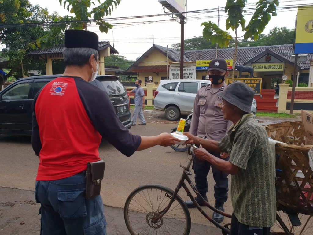 METROPOSTNews.com | Indramayu – Sebagai bentuk rasa peduli dengan sesama, Polsek Haurgeulis jajaran Polres Indramayu Polda Jabar bersama pihak Kecamatan Haurgeulis melakukan kegiatan Jumat Berkah dengan membagikan nasi kotak dan masker kepada warga pengguna jalan yang melintasi depan Mapolsek Haurgeulis, jalan Jenderal Ahmad Yani Haurgeulis, Kabupaten Indramayu, Jawa Barat, Jumat (18/2/2022) pagi.