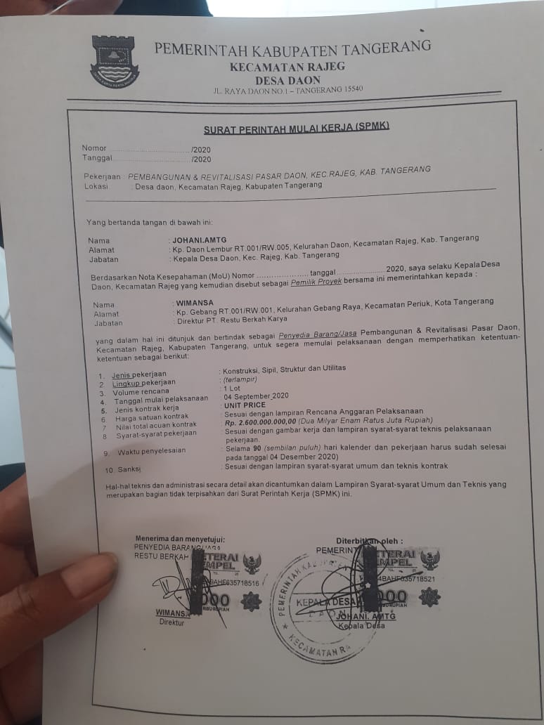 Kami sebagai pengelola Pasar Daon sudah membayar sebesar Rp.1.900.000.000 ,(Satu Milyar Sembilan Ratus Juta Rupiah) masih ada sisa sebesar Rp.700 000,000-, (Tujuh Ratus Juta Rupiah) bukti kwitansi dan perjanjian kerja sama semua nya ada, sedangkan pekerjaan sampai hari ini belum selesai.