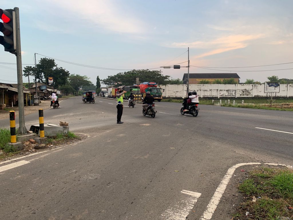 MetropostNews.com | Indramayu – Unit lalu lintas Polsek Widasari jajaran Polres Indramayu Polda Jabar melakukan pengaturan lalu lintas di Simpang Tiga Lampu Merah Bangkaloa Ilir, Kecamatan Widasari, Kabupaten Indramayu, Kamis (21/7/2022).