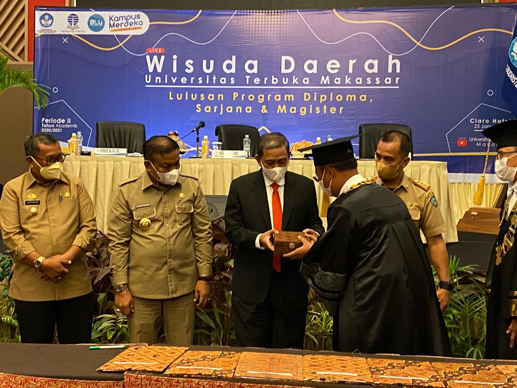 Staf Ahli Bidang Kesejahteraan Rakyat (Kesra), Jayadi Nas, mewakili Pelaksana Tugas (Plt) Gubernur Sulsel, Andi Sudirman Sulaiman, menyampaikan bahwa apa yang dilaksanakan saat ini–di tengah pandemi COVID-19 yaitu pembelajaran jarak jauh secara daring–sudah dilakukan jauh sebelumnya oleh UT.