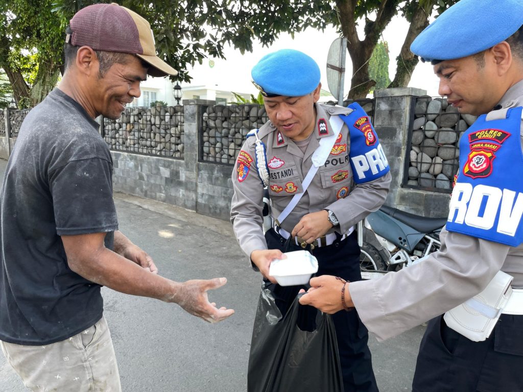 Dalam kegiatan bakti sosial hari ini Si Propam Polres Garut membagikan nasi kotak yang di berikan kepada tukang becak, pedagang asongan dan lainnya.