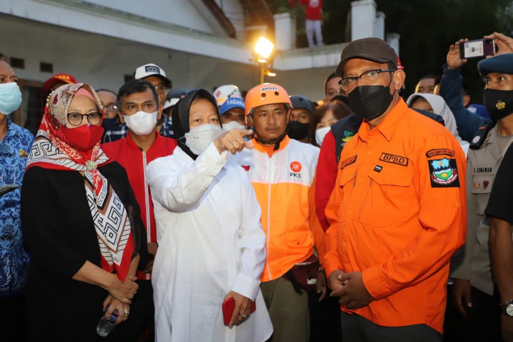 METROPOSTNews.com | GARUT — Menteri Sosial (Mensos) Republik Indonesia (RI) Tri Rismaharini, melakukan peninjauan lokasi bencana banjir bandang di Kampung Ciloa, Desa Mekarwangi, Kecamatan Sukawening, Kabupaten Garut, Senin (29/11/2021). Kedatangan Mensos Risma diterima oleh Wakil Bupati (Wabup) Garut, dr. Helmi Budiman, di lokasi bencana.