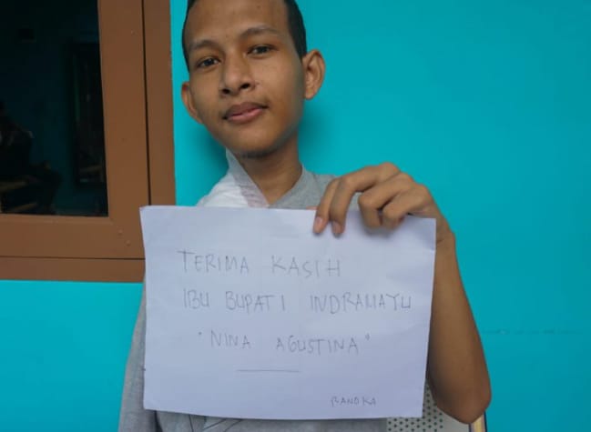 Keceriaan Ranoka terpancar saat menyampaikan terima kasih kepada Bupati Indramayu Nina Agustina yang telah berkunjung di kediamannya dan memberikan bantuan sembako hingga memberikan segala fasilitas untuk menjalani operasi demi kesembuhan tangan kanannya.