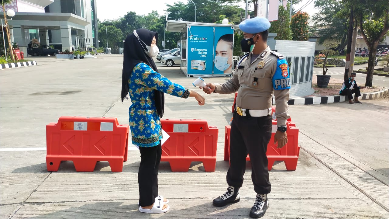 Personel Polresta Tangerang, baik anggota Polri dan ASN sebelum memasuki Mako Polresta Tangerang setiap pagi dilakukan pengecekan suhu tubuh menggunakan Thermal Gun dan pengawasan bagi personel yang tidak menggunakan masker.