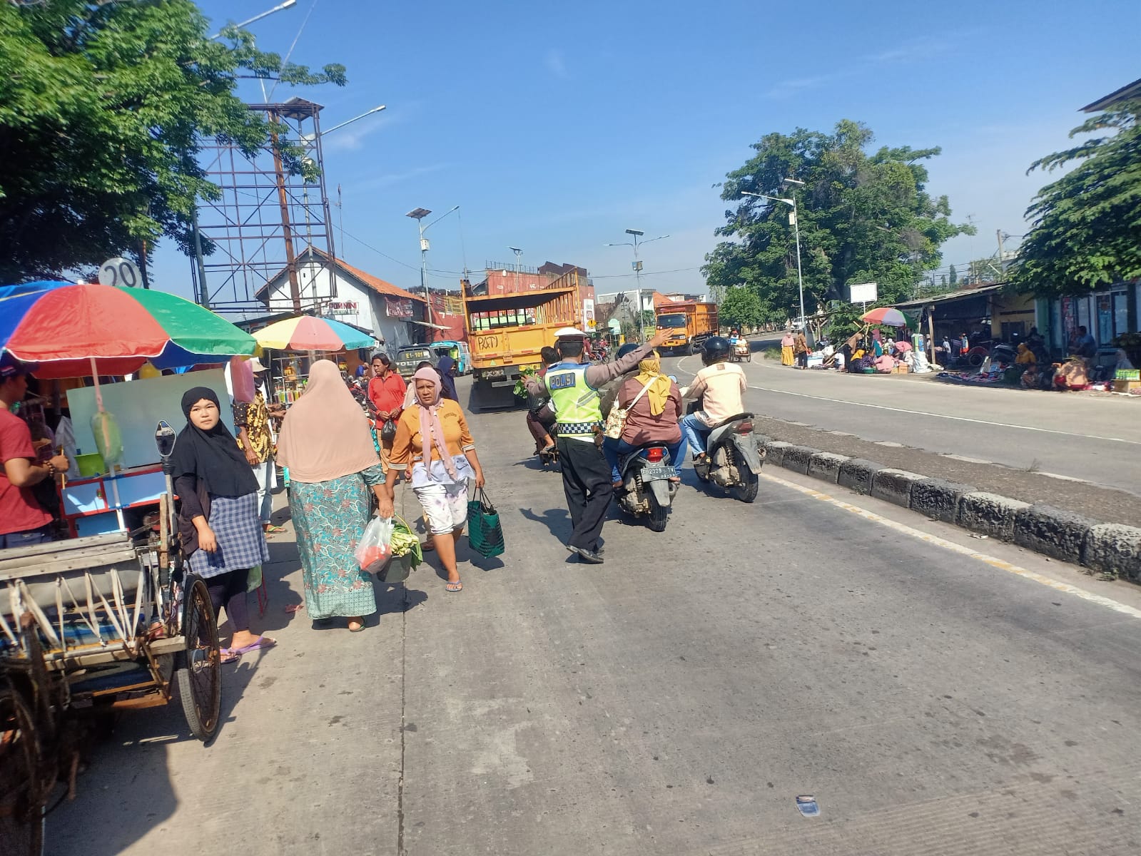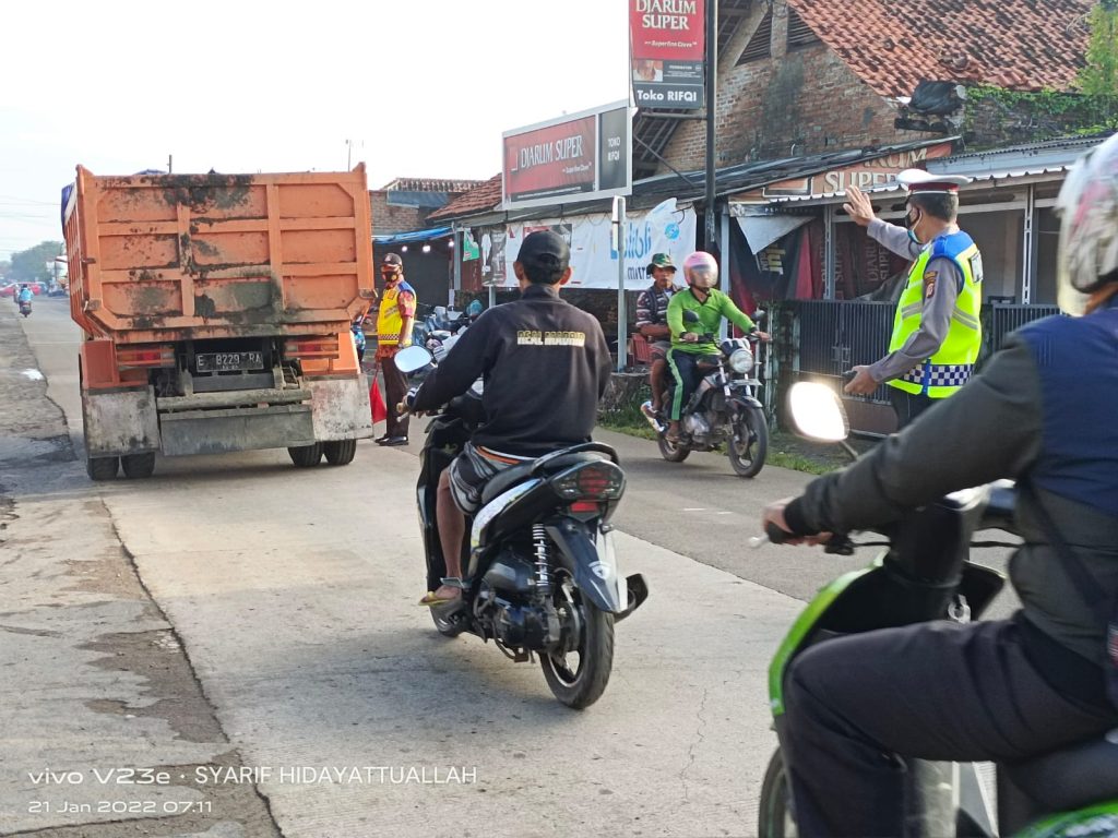 Seperti pagi ini, Unit Lalu Lintas Polsek Kandanghaur melaksanakan pengaturan lalu lintas di depan Pasar Eretan Desa Eretan Wetan, Kecamatan Kandanghaur, Kabupaten Indramayu, Jumat (21/1/2022).