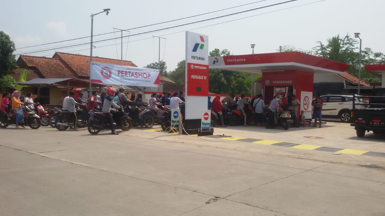 Serbuan warga ini karena pemilik Pom Mini Pertashop menggratiskan bahan bakar jenis Pertamax sebanyak 200 kepada warga yang melintas di jalan raya Bongas – Lojikobong Kec. Sumberjaya.