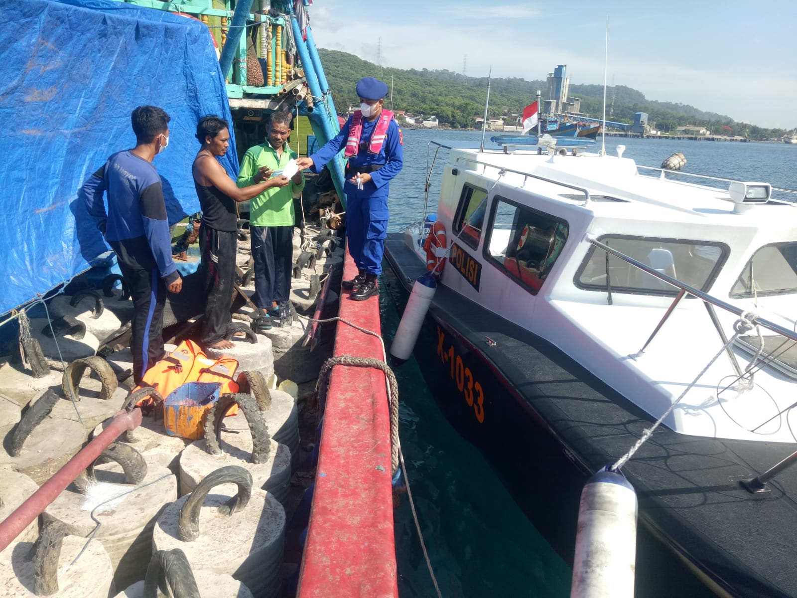Giat di perairan Tanjungwangi, tentang sosialisasi alat keselamatan dan penggunaan lift jaket serta memberikan himbauan protokol kesehatan (prokes), kepada Abk kapal.