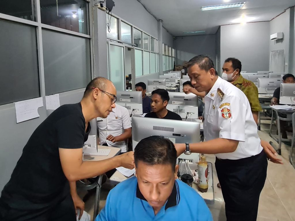 Sekira Pukul 22.00 Wita, Amran yang masih mengenakan pakaian dinas, memperhatikan dan menyemangati langsung para petugas melakukan penginputan di aplikasi P-Care dari Puskesmas yang melakukan vaksinasi door to door atau di lokasi yang jaringan internetnya kurang baik.