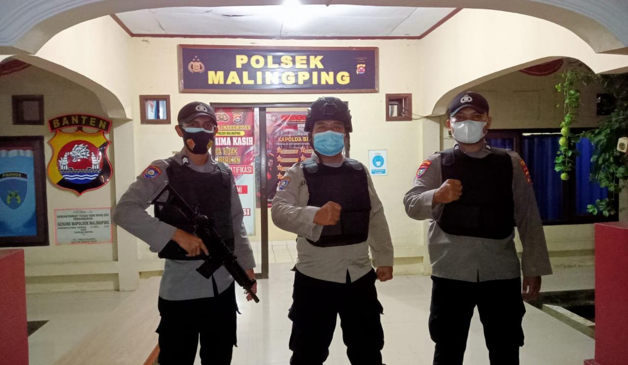 Pengamanan dilakukan ditempat pintu masuk Mapolsek Malingping dengan sikap siap siaga yang dilengkapi dengan sarana pendukung berupa senjata api laras panjang dan rompi.