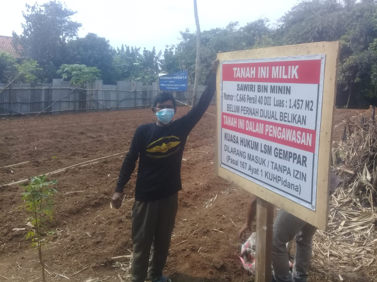 Sawiri memasang plang pemberitahuan yang bertuliskan “Tanah ini Milik Sawiri Bin Minin, Nomor: C 646 Persil 40 D11 Luas: 1,457 M2. Tanah ini dalam Pengawasan Kuasa Hukum DPP LSM GEMPPAR, Dilarang Memasuki Areal Tanah ini tanpa seizin Pemilik, (Pasal 167 ayat 1 KUHPidana)